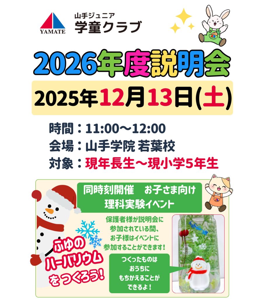 来年度の学童をご検討の方を対象に学童新年度説明会を実施いたします。山手ジュニアの特徴、プラスワンレッスンなどについて詳しくご説明いたします。尚、保護者様が説明会に参加されている間、お子様は理科実験イベント「ふゆのバーバリウムをつくろう!」に参加することもできます。お気軽にお申込みください。