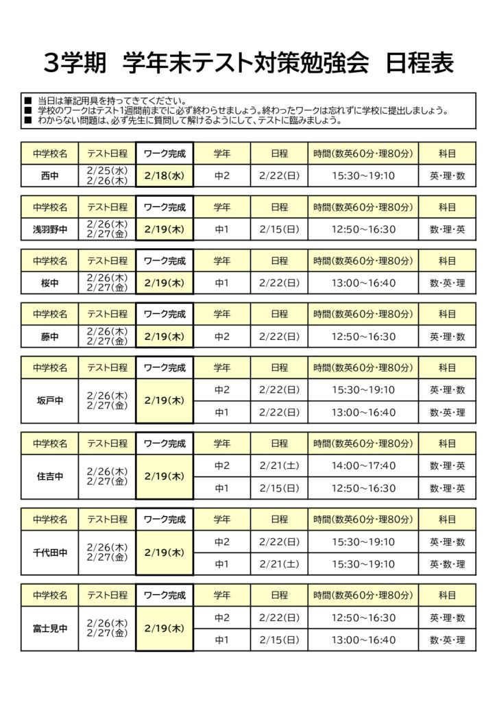 山手学院若葉校では、坂戸市・鶴ヶ島市の中学生(中1/中2)を対象に、期末テストに向けた対策勉強会を以下の日程で実施していきます。現学年最後の定期テストになります。しっかりとした準備をしてテストに臨んでほしいと思います。対策授業は、通常の受講科目に関わらず学校・学年別で数英理の対策勉強会となります。事前に学校のワークの1周目を終わらせておきましょう。お子様のテスト成績向上のため、我々講師一同全力で応援してまいりますので、ぜひご参加いただければと思います。