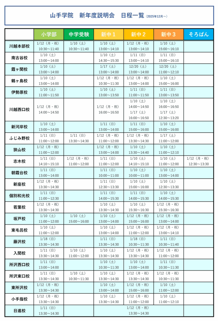 新年度学院説明会(校舎日程一覧)