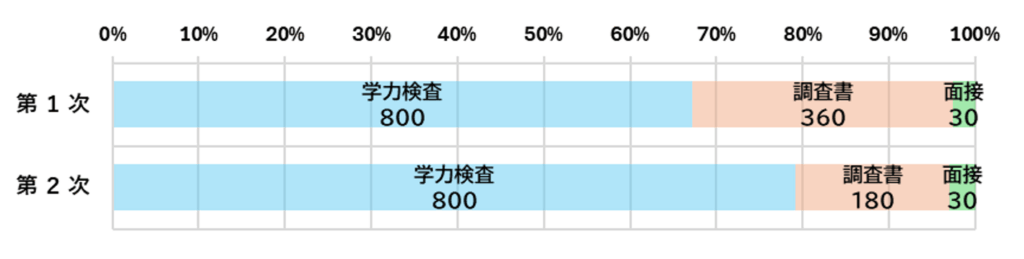 今回の大きな変更点は、各選抜とも国語・数学・英語の3教科で傾斜配点が実施される点であり、これにより配点構造はより明確に学力重視へとシフトしています。割合で見ると、第1次選抜はおおむね学力検査:調査書=7:3、第2次選抜では8:2となり、特に第2次選抜は浦和第一女子に続く県内2位の学力を重視した比率となっています。