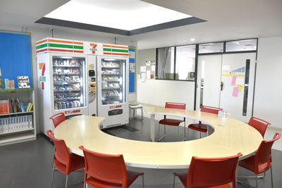 廊下には先生に質問や相談ができるオープンスペースがある。セブンイレブンの自動販売機も注目だ。